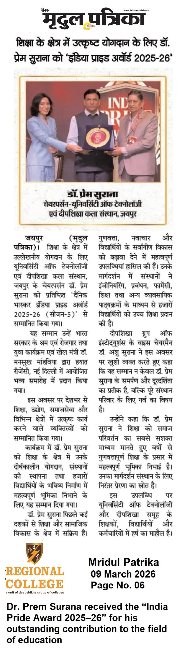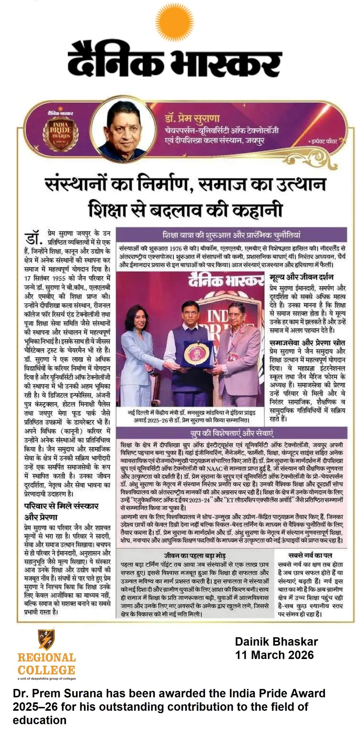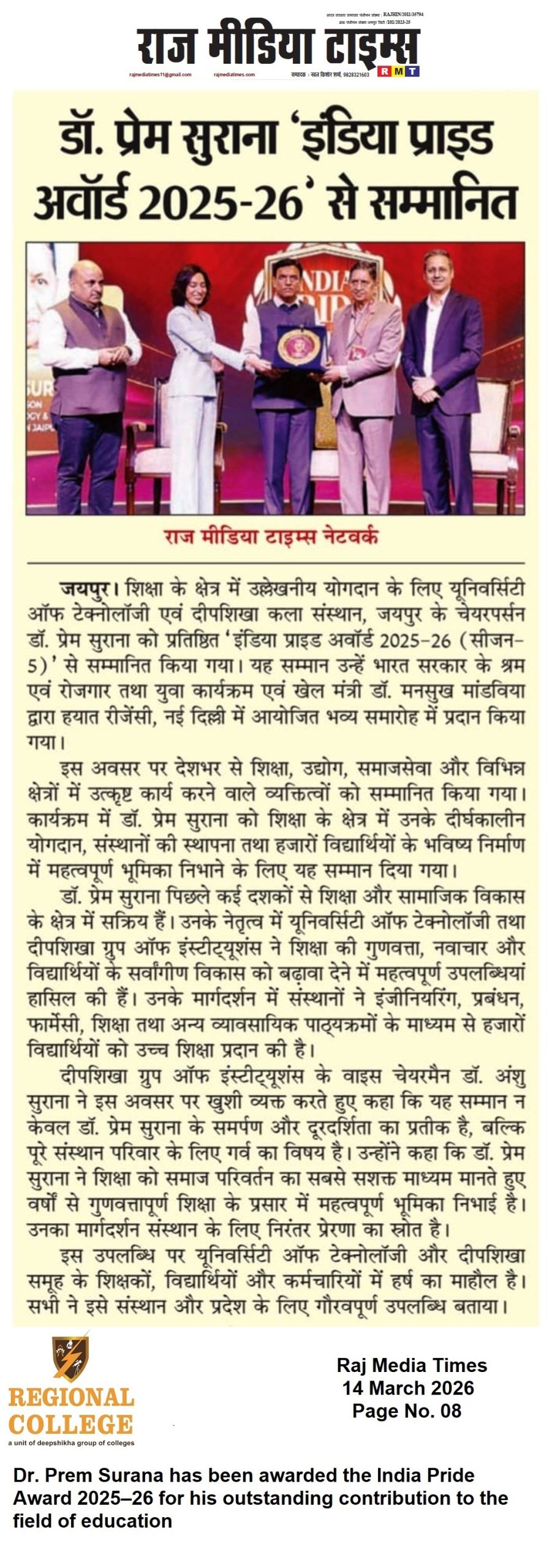Press Media- Dr. Prem Surana has been awarded the India Pride Award 2025–26
